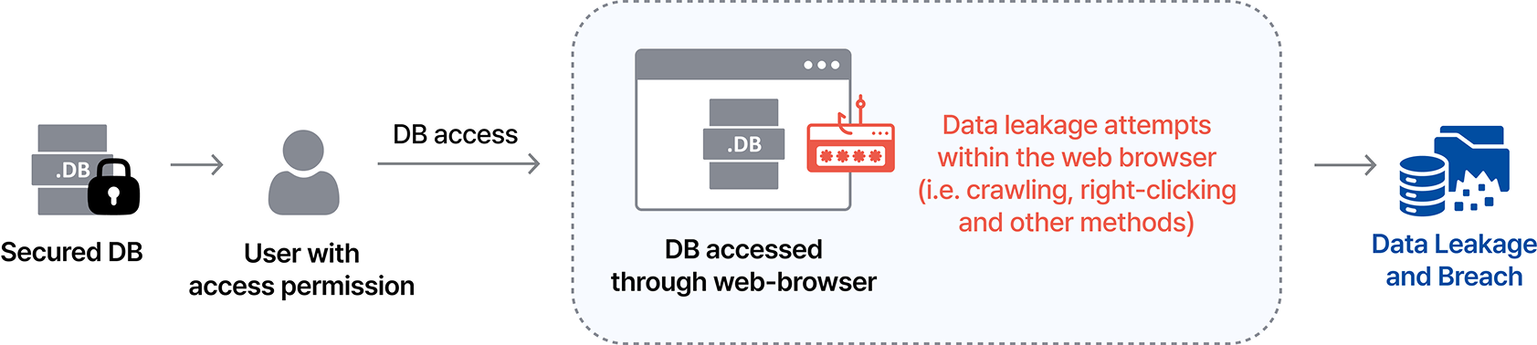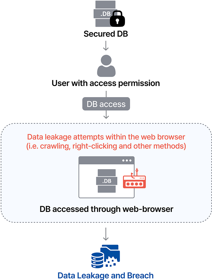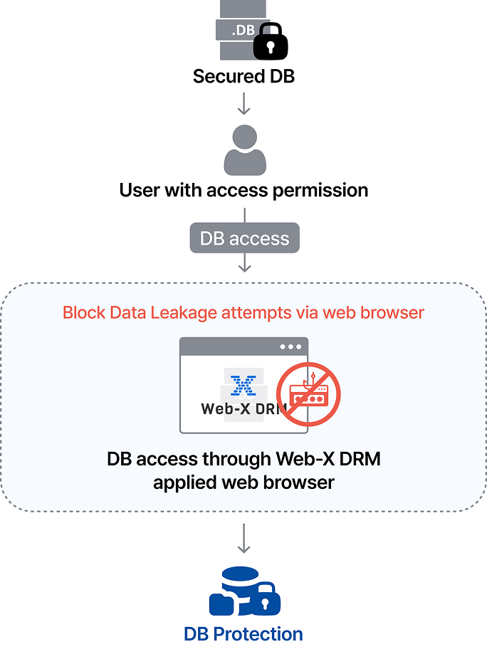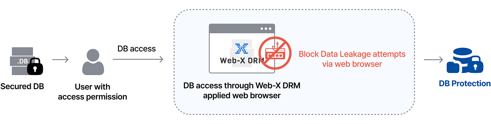 Earlier, we discussed how encrypted and access-controlled database (DB) data can still be easily copied illegally when viewed through a web browser by an authorized user. By applying Web-X DRM to the web browser, authorized users can continue accessing the information as intended while preventing unauthorized duplication.