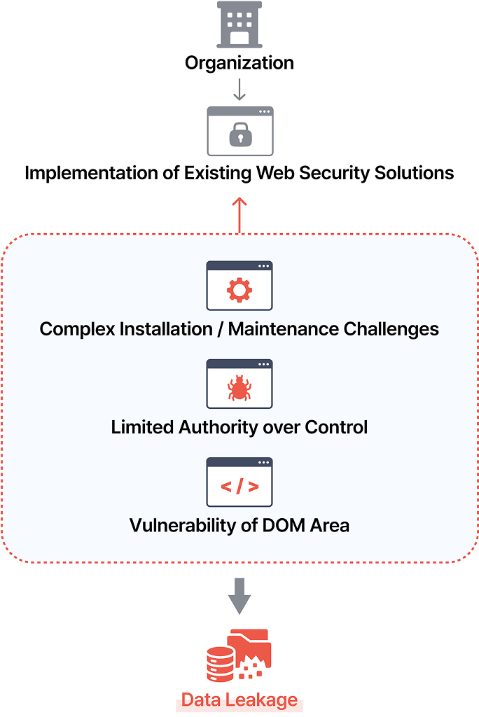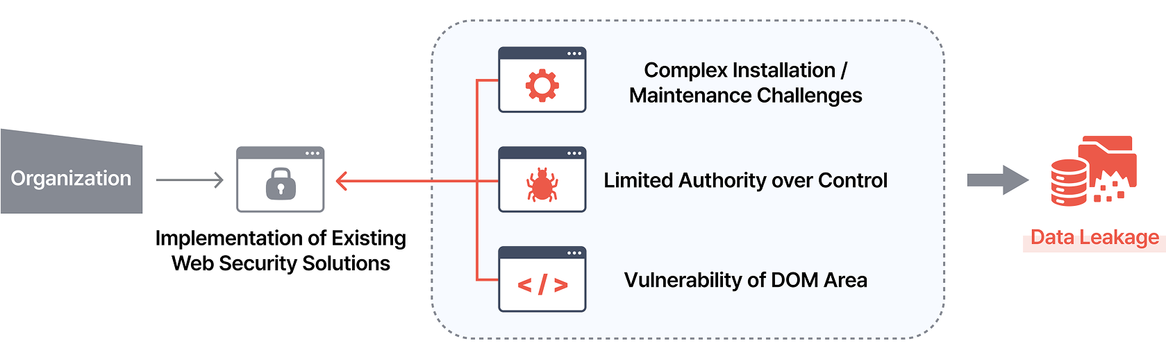 Most existing web security solutions, such as screen capture prevention, often require additional installations, like client-side setups. This makes maintenance across different operating systems challenging and complicates keeping up with updates. As a result, the goal of reducing maintenance costs compared to applications does not align with the shift to web-based services.